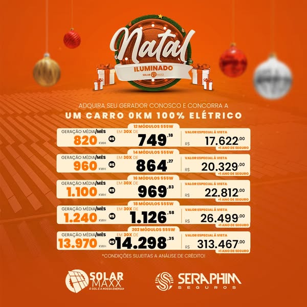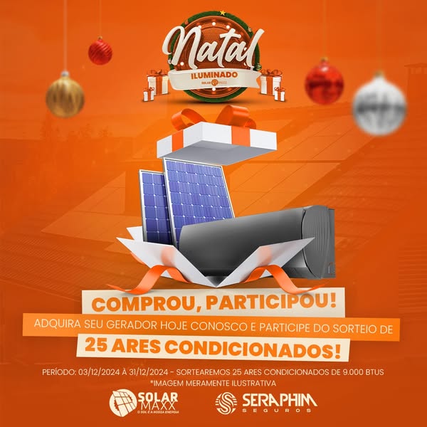 🎄 NATAL ILUMINADO SOLAR MAXX - ÚLTIMAS SEMANAS! 🎅🏻⚡ » Adquirindo o seu gerador conosco, você concorre à 25 ares-condicionados de 9.000 BTU's; » Premiaremos 25 clientes que adquirirem seu gerador no período da campanha; » É mais economia e sustentabilidade para sua vida! » Período da campanha: 03/12/2024 a 31/12/2024 » Consulte um de nossos agentes de vendas! SOLAR MAXX, O SOL É A NOSSA ENERGIA!☀️ Vem Aí.. Aniversário SOLAR MAXX! 🎉