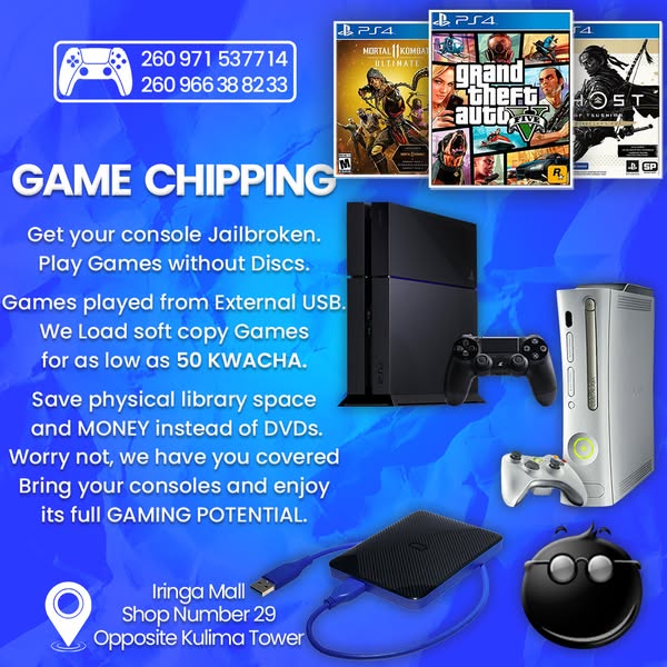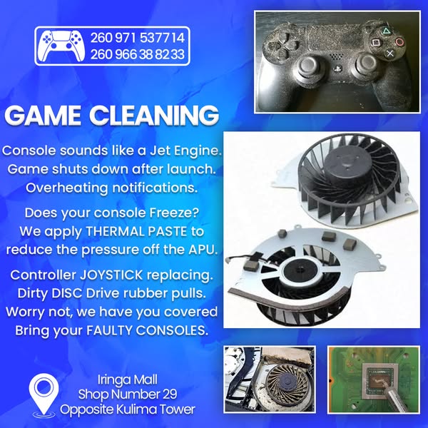 搜索关键词 game console repair, xbox repair, playstation repair, console cleaning service, console chipping, soft copy games, gaming services, iringa mall, gaming console maintenance优势 Wide range of repair services,Console cleaning and maintenance,Console chipping for disc-free gaming,Affordable soft copy games,Convenient location