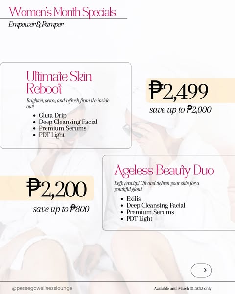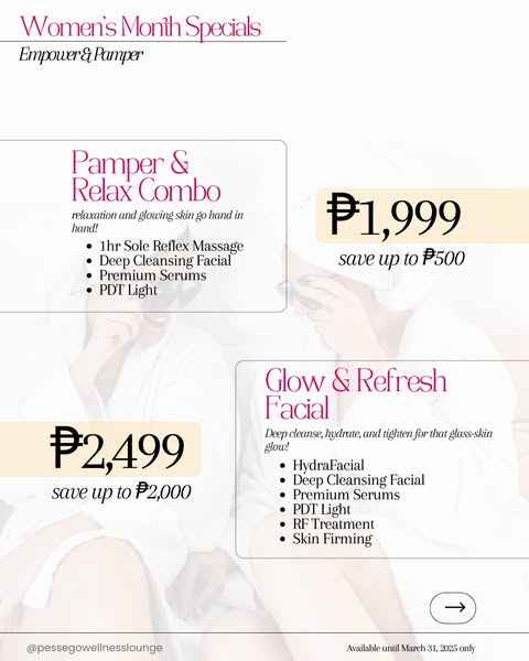 搜索关键词 luxury wellness, womens month specials, summer body, skin tightening, fat burning treatments, Tarlac clinic, aesthetic clinic promo, relaxing massages, rejuvenating skin treatments, limited time offer优势 Huge discounts on premium services,Specials for Women's Month and Summer preparation,Wide range of treatments: facials, massages, fat-burning, skin-tightening