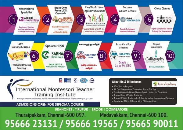 搜索关键词 kids academy, online classes, Chennai education, spoken english, hindi tuition, handwriting classes, abacus maths, art and craft classes, flexible learning, free demo classes优势 Wide range of courses,Flexible timings,Learn from anywhere,Free demo classes