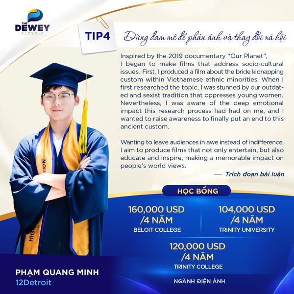 “Tôi nhận ra rằng tất cả chúng ta đều có những điểm chưa hoàn hảo – có điểm lộ rõ, có điểm ẩn sâu bên trong. Nhưng chính những điểm chưa hoàn hảo đó lại góp phần định hình con người ta và hành trình riêng biệt của mỗi người, khiến chúng ta trở nên độc nhất giữa hàng tỷ người trên thế giới.” - Trích bài luận học bổng của học sinh Nguyễn Hà Phương lớp 12Detroit.