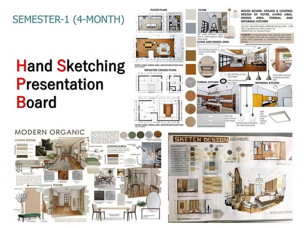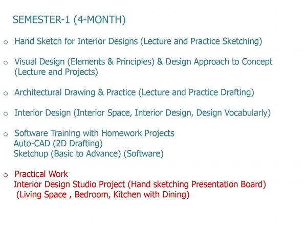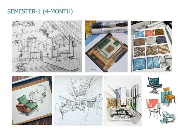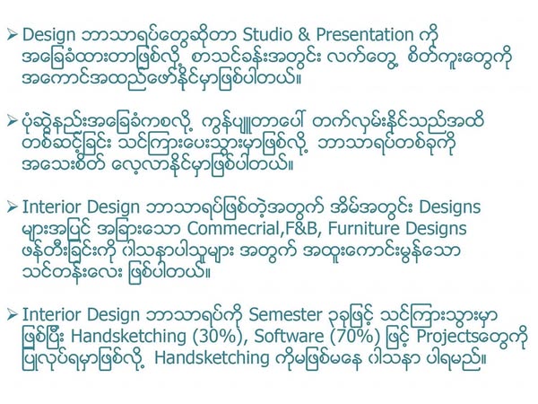 ဒီသင်တန်းသည် **3 Semester** (4 လ တစ်ပိုင်း) ဖြင့် **တစ်နှစ်ကြာ** ပြီးမြောက်မည်ဖြစ်ပြီး, **Interior Design** ကို စိတ်ဝင်စားသော ကျောင်းသူ/ကျောင်းသားများအတွက် **ပုံဆွဲခြင်း**, **Software အသုံးပြုခြင်း**, **Rendering** နှင့် **လက်တွေ့စိတ်ဝင်စားဖွယ် လေ့ကျင့်ခန်းများ** ကို စုစည်းထားသည်။