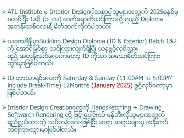 ATL Institute မှ **Interior Design** ကို စိတ်ဝင်စားသူများအတွက် **2025** ခုနှစ် Febuary 8 ရက်နေ့