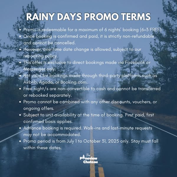 搜索关键词 Baguio homestay, rainy days promo, free nights, Baguio accommodation, family vacation, Philippine travel, book now, limited offer, vacation rentals, affordable travel优势 Free night stay,Wide selection of units,Located in Baguio