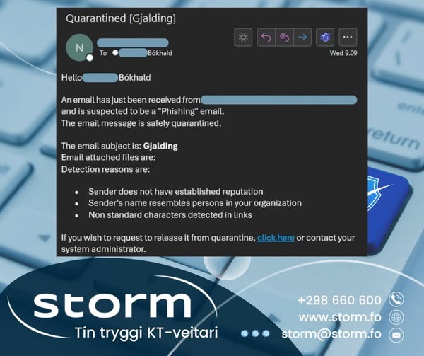 🔹Okkara KT trygdarskipan frá Check Point fangaði í vikuni slíka roynd, og ávaring bleiv send til viðkomandi í fyritøkuni (sí mynd niðanfyri). Talan í hesum føri var um eina umbidna flyting frá stjóranum, ið var send til bókhaldið. Men við røttu KT trygdar loysnunum, vóru boðini meldað og steðgað av skipanini.