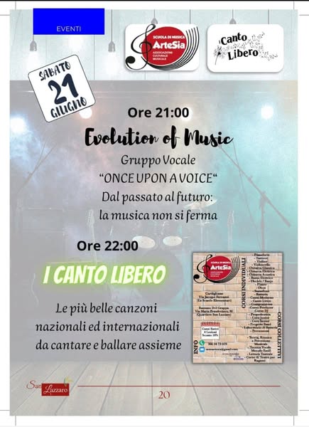 Vi aspettiamo domani sera alla Festa Comunitaria di San Lazzaro A. C. Musicale ArteSia ONCE UPON A VOICE i Canto Libero Oratorio di San Lazzaro