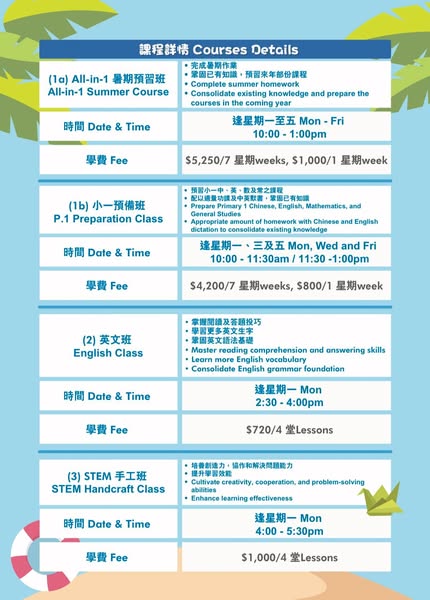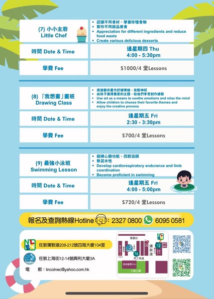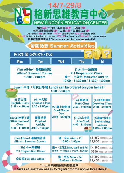 搜索关键词 Summer course, summer activities, kids education, tutoring center, STEAM education, cooking class, swimming class, Jordan Hong Kong, early bird discount, group discount优势 Variety of courses (STEAM, cooking, swimming),Early bird discounts available,Discounts for group enrollment,Full-day options available at affordable price,Experiential learning