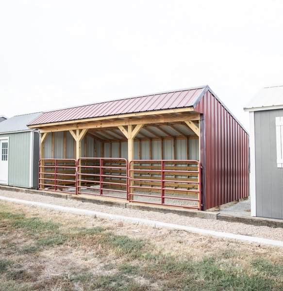 This 12x24 animal shelter is a standard, open-design structure with durable metal siding. Featuring a striking rustic red and black color combination, it provides ample space and protection for livestock. With no gates or stall dividers, it offers a flexible layout for various animal care needs while maintaining a simple and functional design. Price As Shown: $6,185 60 Month RTO Payment: $245