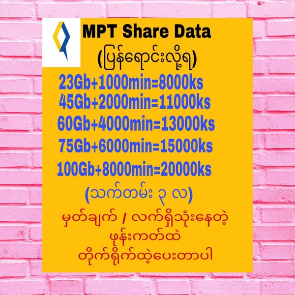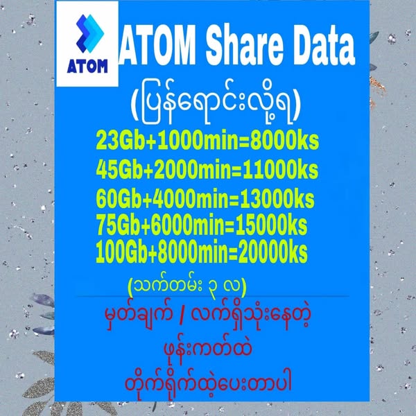 45Gb+2000minဝယ်သူတိုင်းအတွက် 10Gb/ 60Gb+4000minဝယ်သူတိုင်းအတွက် 15Gb/ 75Gb+6000minဝယ်သူတိုင်းအတွက် 20Gb/ 100Gb+8000minဝယ်သူတိုင်းအတွက် 25Gb