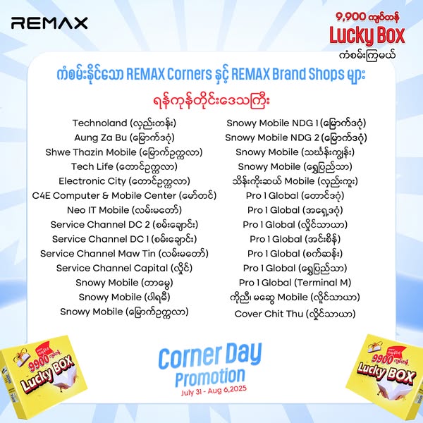 နီးစပ်ရာ REMAX Corners တွေနဲ့ REMAX Brand Shops တွေမှာ REMAX ပစ္စည်းတွေ ဝယ်ယူရင်း Lucky Box လေး လာကံစမ်းလိုက်တော့ဗျာ ..