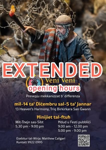 Navzaw li llum it-Tnejn, il-wirja tal-Presepji ta' Franklyn Pace f'Birkirkara, u l-wirja tas-Sur Matthew Caligari f' San Gwann, ser ikunu miftuha b'hinijiet estizi sa 10:00pm. NARAWKOM!