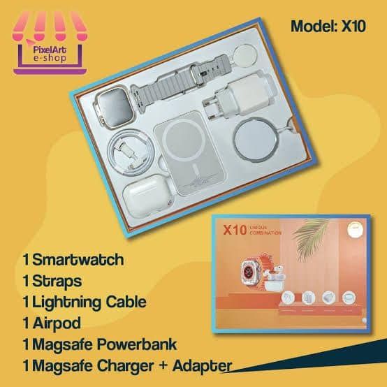 ☑️ X9 complète. Il contient (un airpords certifié, chargeur tpc, et ultra avec deux bracelets)