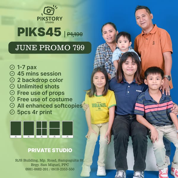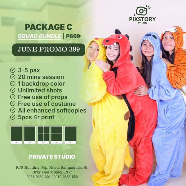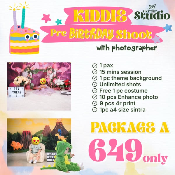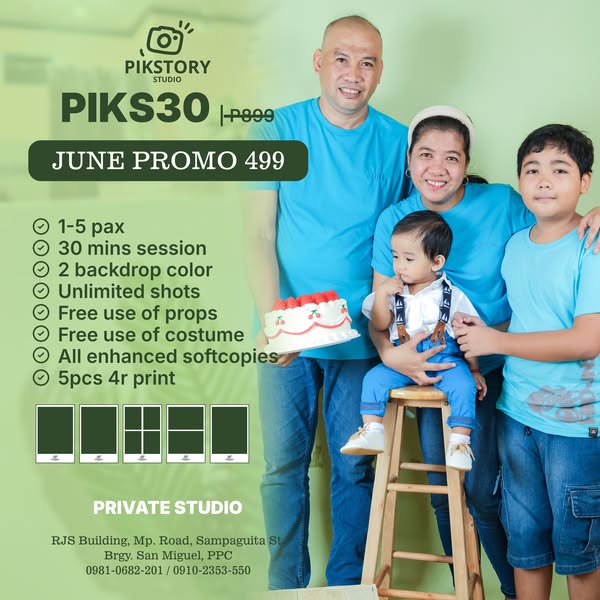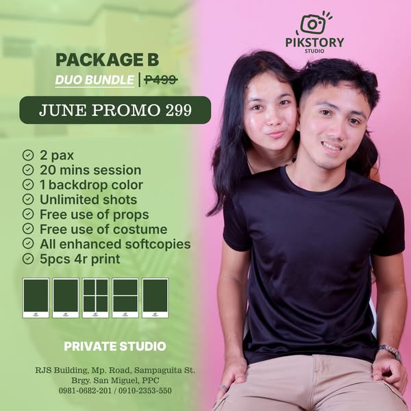 搜索关键词 photo studio promo, self shoot studio, Puerto Princesa photoshoot, affordable photoshoot, pikstory studio, June promo, birthday photoshoot, portrait studio, Sintra Board free, Pikstory Studio Deals优势 Affordable rates starting at 199 Pesos,Free A4-size Sintra Board with package booking,Convenient location in Puerto Princesa,Extended Business Hours (9am-9pm)