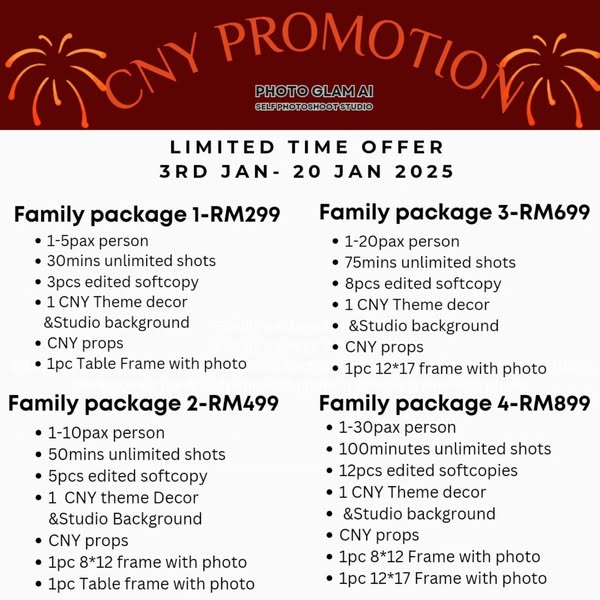 搜索关键词 Chinese New Year Photoshoot, Family Photoshoot Package, Kota Kinabalu Photography, Self Photoshoot Studio, Festive Family Portraits, CNY Promotion, Photoshoot Softcopies, Family Memories, Photoglam KK, Year of the Dragon Family Photo优势 Free high-resolution softcopies,Family bonding experience,Festive theme