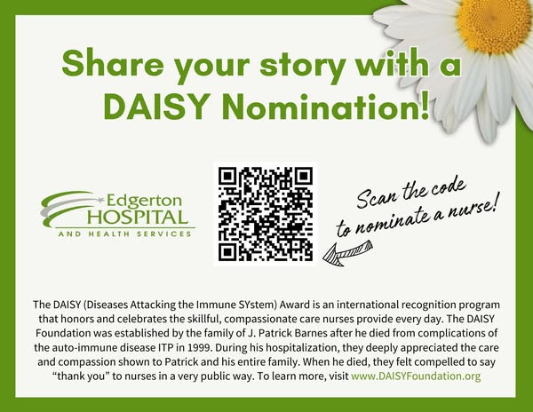Nominate your nurse today for the next Daisy Award given at Edgerton Hospital and Health Services! Get your nominations in soon because this year's winner will be selected before the end of April.