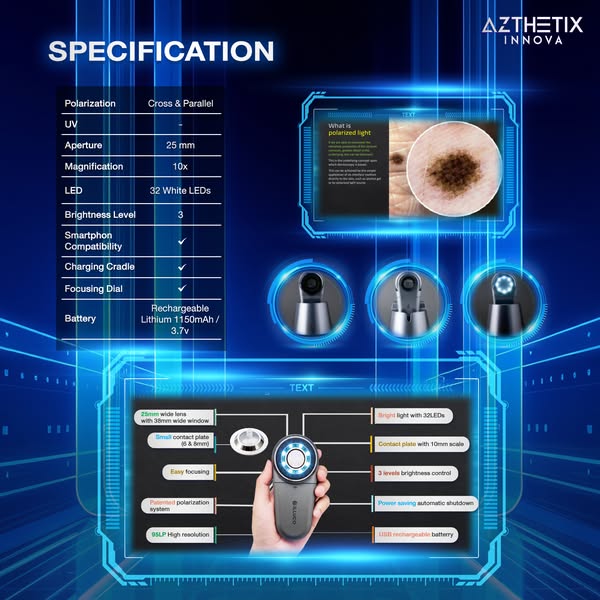 🔬 คุณสมบัติที่โดดเด่นและแตกต่าง : ซูมได้ 10 เท่า พร้อมเลนส์ความละเอียดสูง 95LP เพื่อการวินิจฉัยที่แม่นยำ แสง LED 32 ดวง ปรับความสว่างได้ 3 ระดับ พร้อมเทคโนโลยี Polarized Light ช่วยแสดงโครงสร้างผิวได้ชัดเจน แผ่นสัมผัสขนาดเล็ก (6-8mm) เหมาะกับพื้นที่เล็กและเข้าถึงยาก เช่น บริเวณใกล้ดวงตา