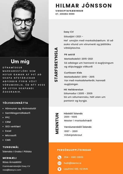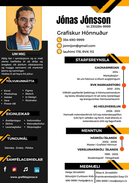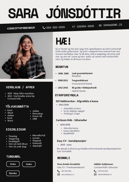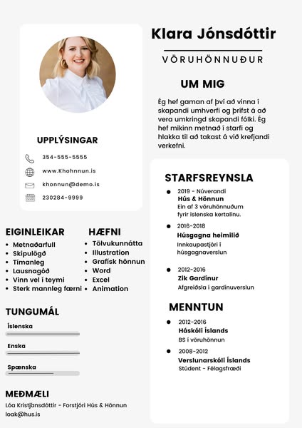 Þekkir þú einhvern sem er í atvinnuleit? Við búum til faglegar ferilskrár sem grípa athygli. Þú velur útlit og sendir okkur upplýsingar um þig og við útbúum frábæra ferilskrá fyrir þig innan 2 virkra daga. Vefsíðan okkar er í vinnslu en það er hægt að panta hér í skilaboðum á meðan.