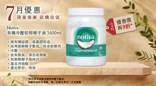 7. Nutiva 有機冷壓初榨椰子油 1600ml (54 oz) (9折)