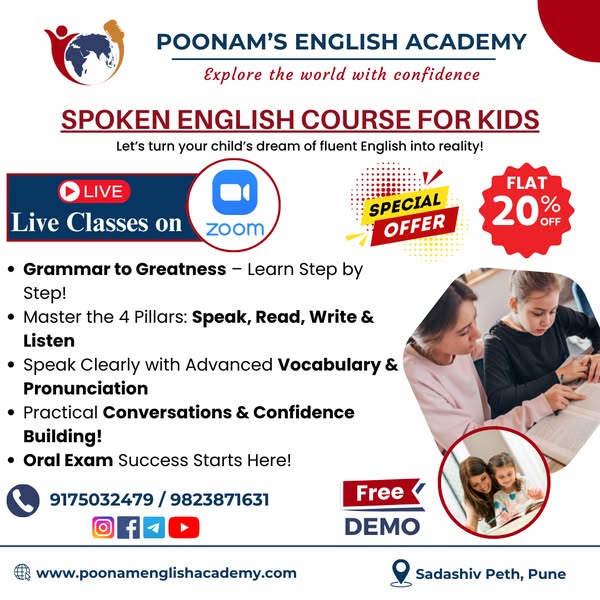 搜索关键词 spoken English classes, english speaking course, online English academy, improve English conversation, English grammar lessons, build confidence speaking, English vocabulary training, best English academy, offline English courses, Poonam English Academy优势 Offline and Online Classes,Comprehensive Curriculum (grammar, vocabulary, conversation),Confidence-building Techniques,Supportive Environment