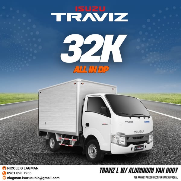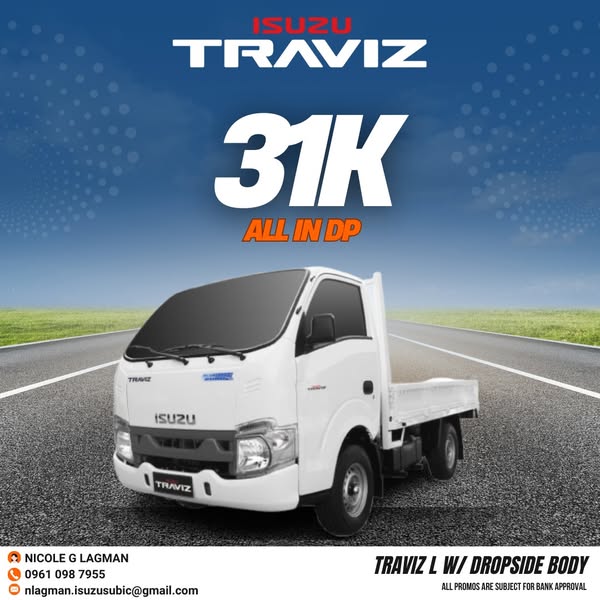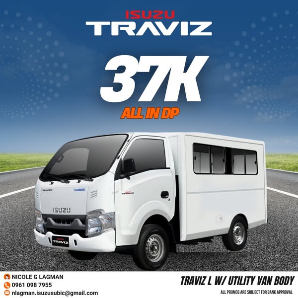 搜索关键词 Isuzu Traviz, Business Partner, Commercial Vehicle, Fuel Efficient Truck, High Payload, Philippines Truck, Isuzu Subic, March Promo, ₱100K Cash Discount优势 Fuel-efficient for cost-effective operations,High payload capacity for better business performance,Reliable engine & low maintenance costs,Various body configurations available (Utility Van, Dropside, Aluminum Van, Refrigerated Van),Limited-time freebies (LTO Registration, Insurance, Chattel Mortgage Fee, etc.),Flexible Payment Options