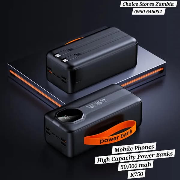 搜索关键词 mobile power bank, 50000mah power, fast charging powerbank, iphone android powerbank, free delivery lusaka, power bank sale, usb c power bank, portable phone charger, long lasting powerbank, overcharge protection优势 Large Capacity (50000mAh),Multiple Charges (7X),Universal Compatibility (iPhone & Android),LED Display,USB C PD 22.5W Fast Charging,Overcharge Protection,Temperature Protection,Short Circuit Protection,Free Delivery in Lusaka,Payment After Delivery