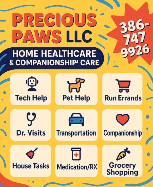 #VolusiaCountyServices #DeLandFlorida #PreciousPawsLLC #OneStopShop #Childcare #SeniorCare #PetCare #LawnCare #HomeServices #TrustedLocalBusiness #SupportSmallBusiness