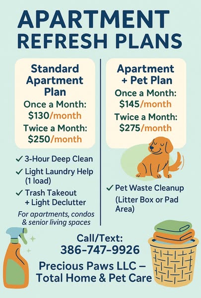 We’re Precious Paws LLC, a locally owned and operated business proudly serving DeLand and surrounding areas. We’re not just a company — we’re your neighbors, and we care deeply about helping families, seniors, and busy households thrive with reliable, professional support.