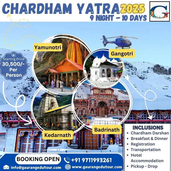 "🌄 Experience the Divine Beauty of Chardham 🌄 Travel to the sacred temples of Yamunotri, Gangotri, Kedarnath, and Badrinath with our expertly planned Chardham Yatra. Let this journey refresh your spirit and bring you closer to the divine. 🕉️ ✨ What Makes Our Yatra Special? VIP Darshan: Skip the waiting time and immerse yourself in the holy experience with VIP access. Fully Customized Packages: Choose from a range of options that match your needs, preferences, and budget. Comfortable Travel: Relax during your journey with comfortable vehicles and well-organized arrangements. Experienced Guides: Learn the history and spiritual significance of each temple with our expert guides. 🌸 Don’t miss out on this spiritual journey of a lifetime. Secure your place today and get ready to experience peace and blessings like never before. 🙏 Limited seats available – Book your Chardham Yatra now! 🙏" Let me know if you need more options or further tweaks!