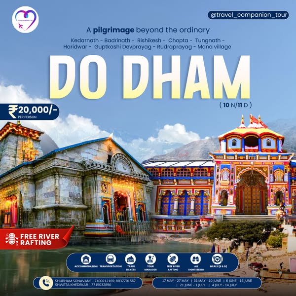 🕉️ A Sacred Pilgrimage Awaits You 🕉️ Explore the holy shrines of Kedarnath, Badrinath, Rishikesh, Chopta, Tungnath, and more, on our Do Dham Pilgrimage Tour. Visit some of the most revered spiritual destinations in the country and find peace and tranquility. ✨ Package Includes: ✅ Accommodation ✅ Transportation ✅ Train Tickets ✅ Meals (Breakfast & Dinner) ✅ Tour Manager & Sightseeing ✅ Free River Rafting 🌄 Price: ₹20,000/- per person 📅 Dates: May 17th - 27th, May 31st - June 10th, June 6th - 16th, and more! 🌸 Don't miss your chance to embark on this sacred journey! Click below to chat with us on WhatsApp and book your spot now!