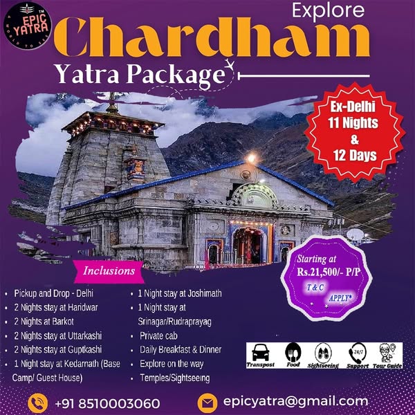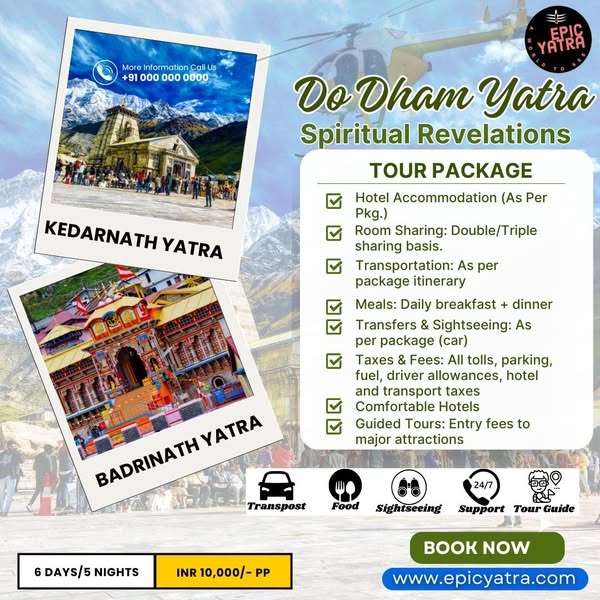 Epic Yatra presents a 3-night, 4-day Do Dham Yatra Package by helicopter at Rs 1,25,000. Its holy journey covers any of the two among four revered locations in the Chardham Yatra through which pilgrims can seek divine bliss. In the Do Dham Yatra, devotees visit two chosen destinations namely either Yamunotri, Gangotri, Kedarnath, or Badrinath. Visit -