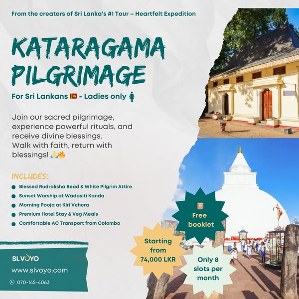 Thinking of visiting Kataragama for a sacred experience? This is a once-in-a-lifetime pilgrimage! 🔥 Take part in the powerful rituals at Wadasit Kanda, morning pooja at Kiri Vehera, and travel in comfort with AC transport. A 2-day, 1-night journey that fills your soul with blessings! Hurry, slots are limited! ✨ What’s Included? ✅ Blessed Rudraksha Bead & White Pilgrim Attire ✅ Sunset Worship at Wadasiti Kanda ✅ Morning Pooja at Kiri Vehera ✅ Premium Hotel Stay & Veg Meals (1 Night) ✅ Comfortable AC Transport from Colombo Call 0701454063 or WhatsApp us now for your FREE booklet!