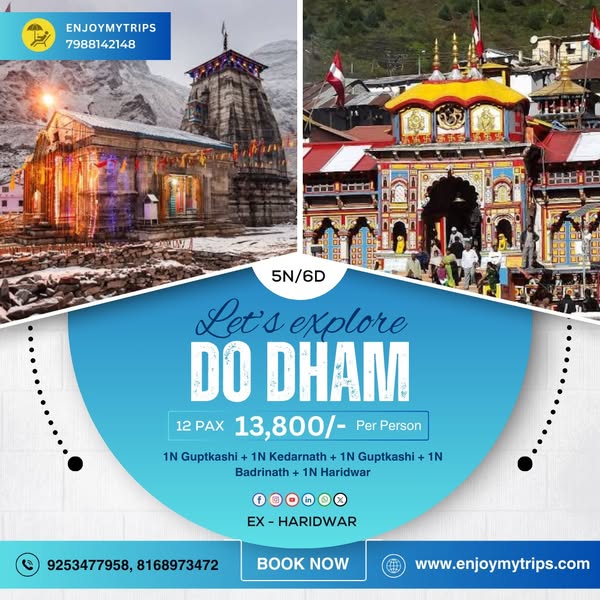 🚩 Embark on a soulful Do Dham Yatra (Kedarnath & Badrinath) – 5N/6D for just ₹13,800 per person (12 Pax)! ✨ 🌿 Comfortable transport | Best stays | Delicious meals 🙏 A hassle-free, spiritual journey at the best price! 📅 Limited Seats Available – Book Your Journey Now! 📞 Call Us: +91-7988142148 #DoDhamYatra #KedarnathBadrinath #SpiritualJourney #PilgrimageTour Note: No Helicopter Service Available.