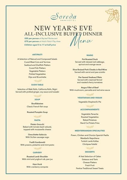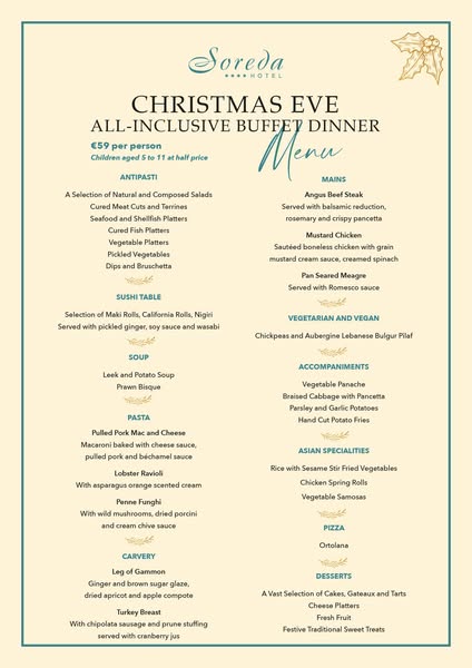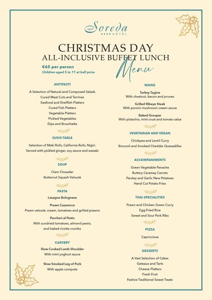 搜索关键词 Soreda Hotel, Christmas Buffet, Malta holiday, All inclusive, Holiday memories, Qawra hotel, Christmas dinner, Family celebration, Hotel events, Special offers优势 All-inclusive buffet,Creates holiday memories,Convenient booking