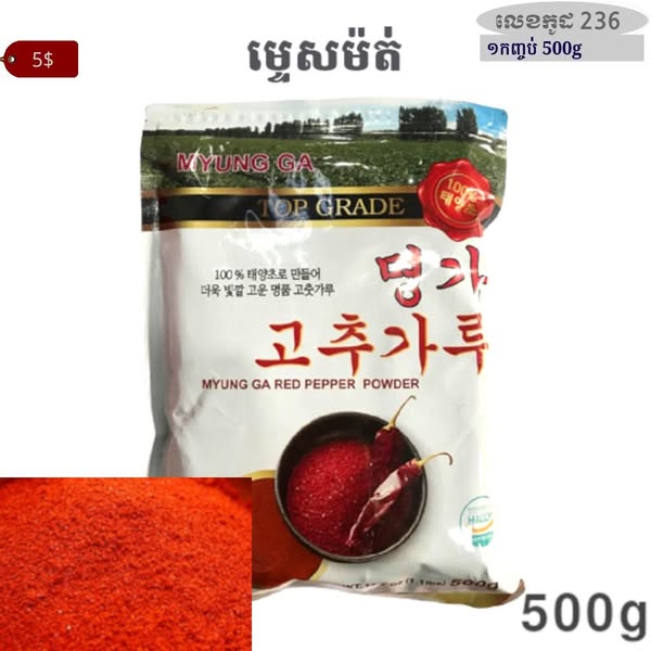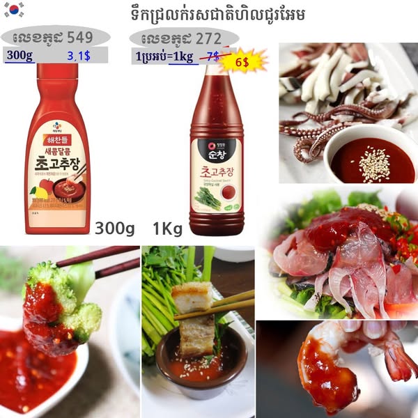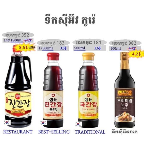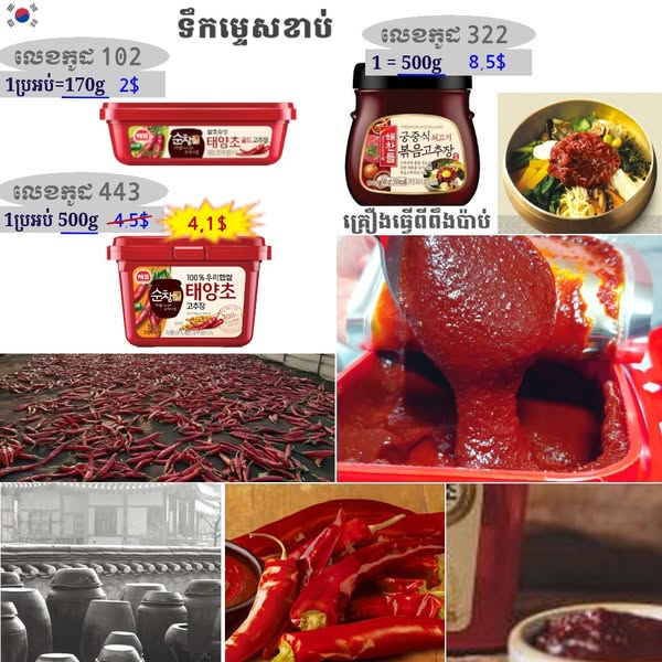 - ម្សៅម្ទេស ម្សៅម្ទេសគ្រើម ម្សៅម្ទេសម៉ត់ ម្សៅម្ទេសកូរ៉េ ទឹកជ្រលក់សៀង ទឹកជ្រលក់សៀងកូរ៉េ សៀងខាប់សម្រាប់ធ្វើម្ហូប សៀងខាប់សម្រាប់ធ្វើម្ហូបកូរ៉េ ទឹកជ្រលក់រសជាតិជូរអែម ទឹកស៊ីអ៊ីវ ទឹកស៊ីអ៊ីវកូរ៉េ ទឹកត្រីកូរ៉េ គ្រឿងធ្វើមីខ្មៅ គ្រឿងការីកូរ៉េ ទឹកជ្រលក់ញ៉ាំជាសាច់បំពង ទឹកជ្រលក់ញ៉ាំជាមួយខ្ទឹមបារាំង ទឹកប្រហុកបែបកូរ៉េ អំបិលឆ្ងាញ់ អំបិលរសជាតិប៊ីចេង ប្រេងល្ង ផ្អកកំពឹសកូរ៉េ កូនត្រីក្រៀមកូរ៉េ គ្រឿងសម្រាប់រម្ងាស់ធ្វើទឹកស៊ុប ទឹកស៊ុបត្រីរម្ងាស់រួច ទឹកស៊ុបមាន់ ម្សៅស៊ុបខ្នុរ គ្រឿងធ្វើតុពុកគី គ្រឿងធ្វើគីមឈី ទឹកដោះគោខាប់សូកូឡា គ្រឿងធ្វើនំបញ្ចុក ទឹកស៊ីអ៊ីវត្រាំគ្រឿងសមុទ្រ គ្រឿងច្របល់បាយបែបកូរ៉េ ទឹកម្ទេសមីហឹរ ទឹកស្ករខាប់ គ្រឿងមីកូរ៉េ ទឹកពុទ្រាត្រាំ គ្រឿងសម្រាប់ធ្វើស៊ុបចង្កាក់បែបកូរ៉េ ទឹកម្ទេសហឹរ ទឹកជ្រលក់ញ៉ាំជាមួយសាច់បំពង ម្សៅមីសម្រាប់ធ្វើនំភីហ្សាបែបកូរ៉េ ល្ងគ្រាប់ ប្រេងម្ទេស ម្សៅធ្វើនំផេងខេក ទឹកខ្មេះកូរ៉េ សារាយសមុទ្រក្រៀម ទឹកខ្មេះផ្លែប៉ោមកូរ៉េ ម្សៅបំពង