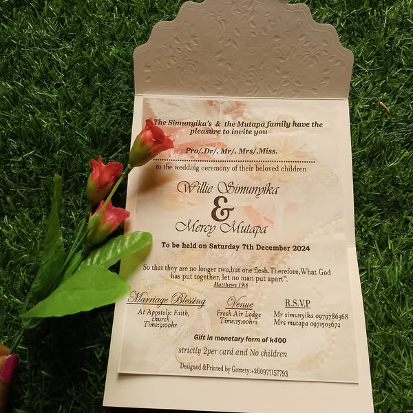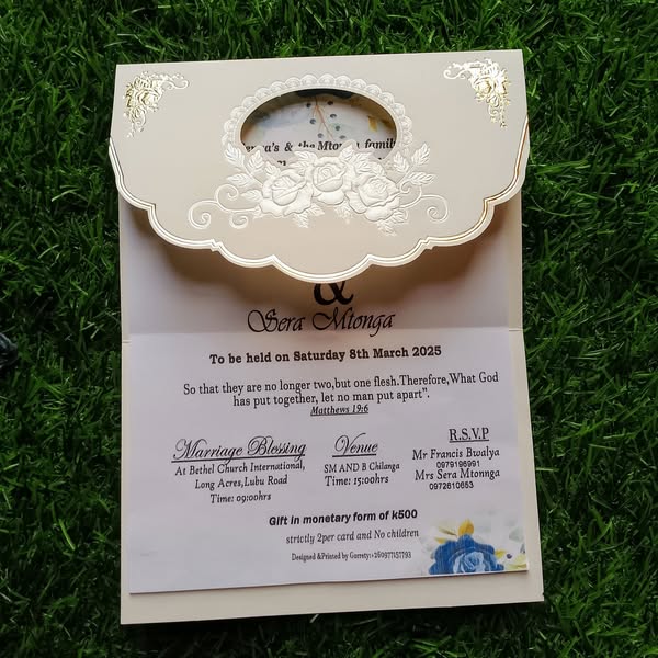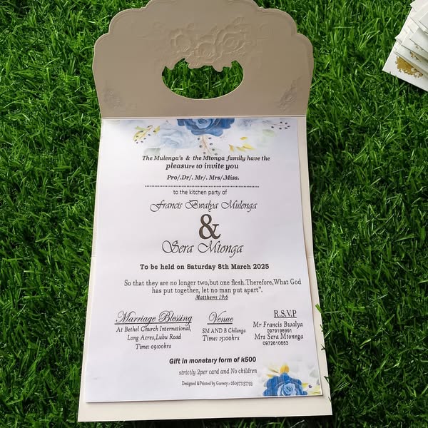 Our bespoke invitation cards design are now available and done at an affordable price, Wether it's a wedding, kitchen party, come together, our team will work with you to create stunning one-of- a- kind invitation cards that reflects your style and elegance. Contact us 977157793 for orders location Lusaka