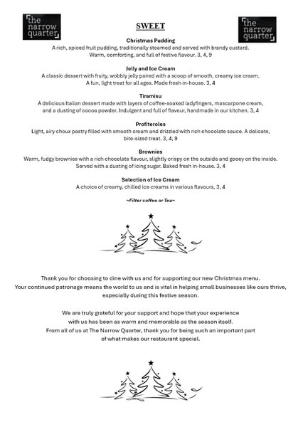 With a variety of evening specials lined up throughout the season, there’s always something new to discover. Bookings are filling up fast, so secure your spot for tomorrow night and make this Christmas season truly special! 🎅✨ #TheNarrowQuarter #ChristmasSetMenu #FestiveDining