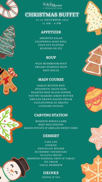 搜索关键词 Christmas buffet, festive dining, Kokol Haven, resort Christmas, holiday gathering, Malaysia resort, scenic dining, Christmas celebration, family Christmas dinner, holiday promotion优势 Festive dishes,Perfect for gatherings,Scenic view