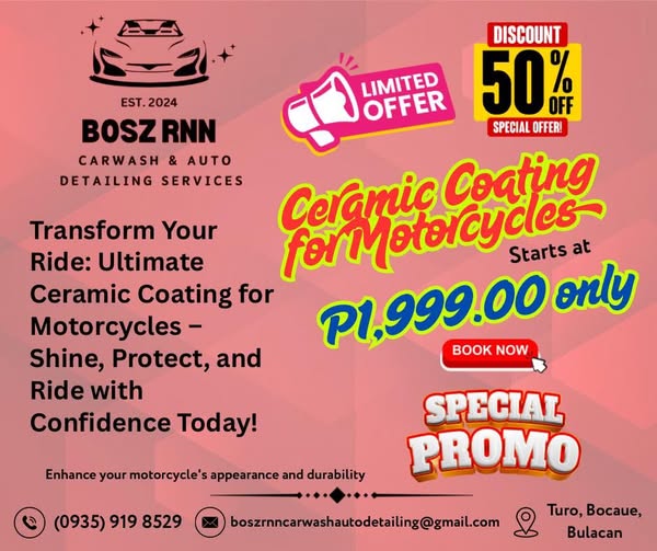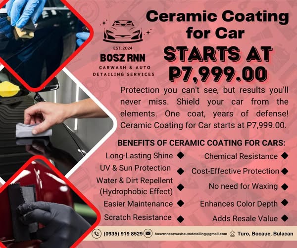搜索关键词 carwash detailing, auto detailing services, ceramic coating, graphene coating, paint protection film, premium tint, car accessories, Bocaue Bulacan carwash, car VIP services, BOSZ RNN Carwash优势 Comprehensive car care services,VIP treatment guarantee,Multiple payment options,Easy to find location (Waze Google Maps)