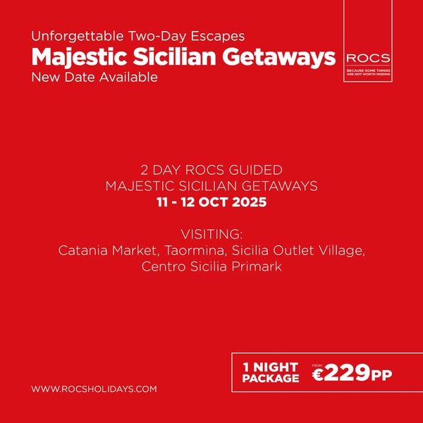#ROCSTravel #ROCSGetaways #SicilyGetaway #ShoppingInSicily #CataniaMarkets #TaorminaVibes #SicilianOutletVillage #CentroSicilia #PrimarkFinds #ShopAndTravel #TravelWithROCS #ROCSJourneys #MediterraneanEscape #ItalianGetaway #TravelDeals #TravelInStyle #OctoberEscape #SicilyCalling #ShoppingHoliday #CultureAndShopping #SicilianExperience #TravelAddict