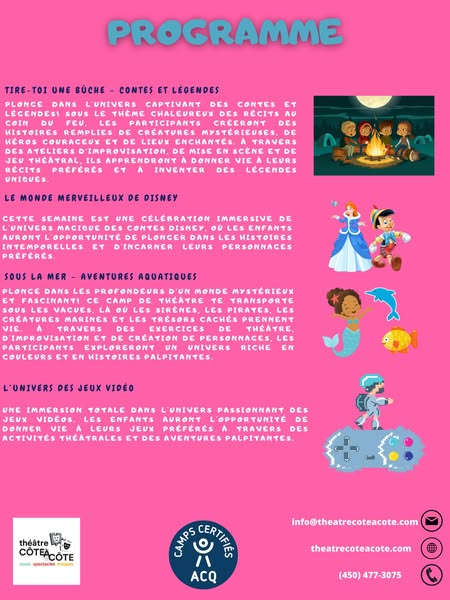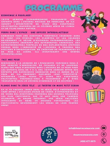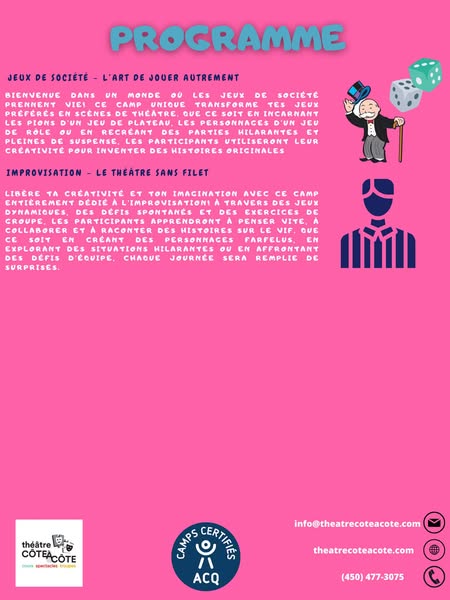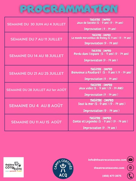 搜索关键词 summer camp, theatre program, improvisation workshop, mascouche activities, school program, kids activities, summer learning, performing arts, cote a cote, amilia registration优势 Specialized program in theatre and improvisation,Located at Le Rucher School in Mascouche,Runs from June 30th to August 15th
