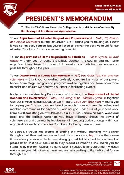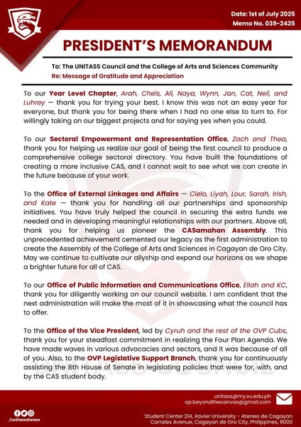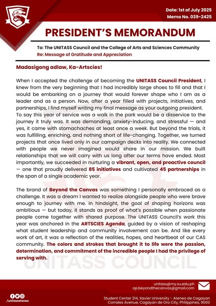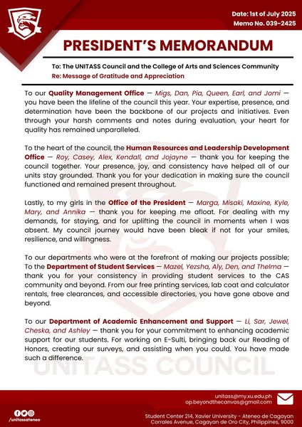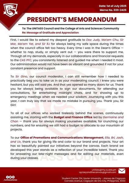 搜索关键词 President's Memorandum, Shaping Horizons, UNITASS, Gratitude Message, Appreciation Note, University Announcement, Educational Institution, Future Vision, Campus Communication, Academic Community优势 Expresses gratitude and appreciation,Highlights future vision (Shaping Horizons)