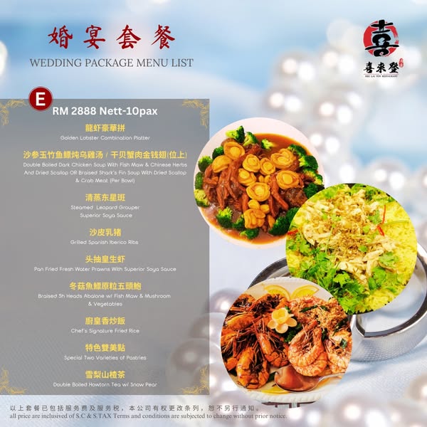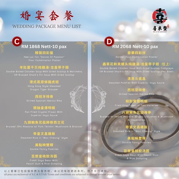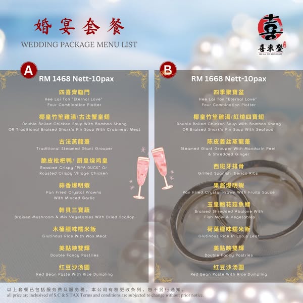 🍽️ 套餐亮点: 🌟 RM 1468 – RM 2888 每桌10位宾客 🌟 地道粤菜,甄选顶级食材 🌟 丰富选择,包括清蒸龙虎斑、西班牙猪肋排、鲍鱼炖翅和更多美味! 🌟 经典甜品如红豆沙汤圆为您的盛宴画上甜美句号