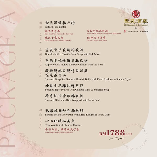 💍 聚苑酒家隆重向您推薦2025婚宴套餐,每桌僅從 RM1788 起。為您的婚禮增添高雅風采,我們的婚宴菜單精選上乘食材,搭配創意擺盤,讓每一道菜成為視覺與味覺的雙重享受。✨
