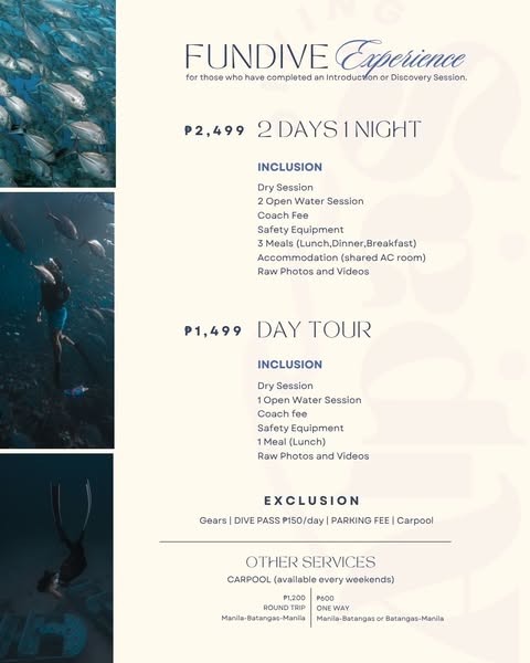 You don’t have to be a swimmer. You don’t have to be experienced. You just have to show up! Everyone starts somewhere and we’re here to guide you every step (and breath) of the way. Whether it’s your first time in the water or you’re aiming for certification, we got you! Join us and learn a new skill that brings confidence, calm, and freedom. 📍 Mabini, Batangas | Carpool available every weekend Click "Book now" to reserve your spot!
