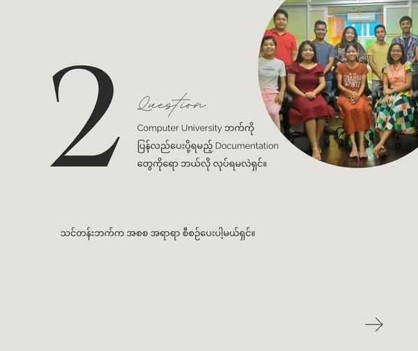 👩🏫PROJECT ရေးဆွဲသည့်နေရာတွင် ပူးပေါင်းကူညီပေးရုံသာမက INTERNSHIP PRESENTATION များကို ကူညီဆောင်ရွက်ပေးသွားဦးမည်လည်း ဖြစ်ရာ MICROSOFT WORD/ EXCEL/ POWERPOINT များကိုပါ FREE သင်ကြားခွင့်ရရှိဦးမှာပါ။ ဒါ့အပြင် SOFTWARE DEVELOPER တစ်ယောက်ရဲ့ နေ့စဥ်လုပ်ငန်းဆောင်တာတွေ ၊ TEAM MEMBER တွေနှင့် ပူးပေါင်း လုပ်ဆောင်မှုတွေ ၊ OFFICE PROTOCOL တွေကိုပါ တကယ့်လုပ်ငန်းခွင်အတွင်း လေ့လာခွင့် ရဦးမှာပါ။💻