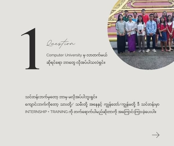 搜索关键词 computer science internship, Myanmar training program, software development training, university internship program, MICT Park training, Ultimate Solutions internship, IT internship Myanmar, computer university internship, practical software training, career development training优势 Comprehensive Training + Internship Program,Experienced Lecturers and Lead Developers,Real-world Project Experience,Free Microsoft Office Training,Exposure to Software Developer Workplace,Comfortable Facilities