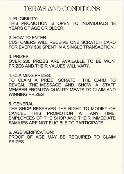 搜索关键词 Shopping promotion, Win cash, Scratch card, Grocery prizes, Butcher shop, Meat pies, Discount vouchers, BBQ gift card, Christmas vouchers优势 Chance to win cash and prizes,Multiple prize tiers,Engaging scratch card mechanic