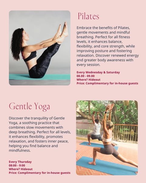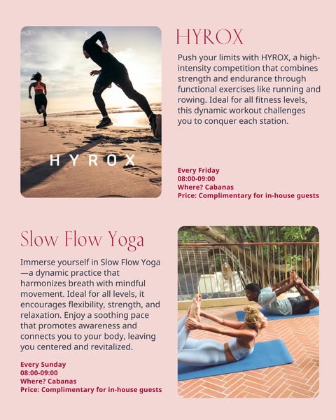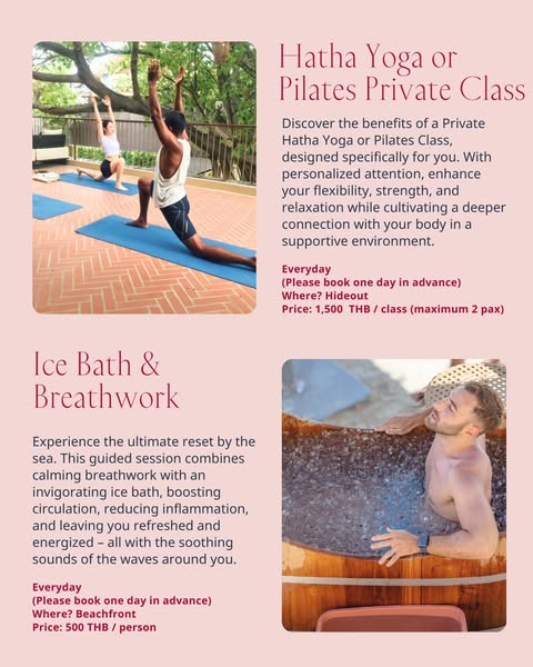 💪 Don’t miss our special wellness experiences (book 1 day in advance) featuring Ice Bath & Breathwork, Hatha Yoga, or a Private Pilates Class.