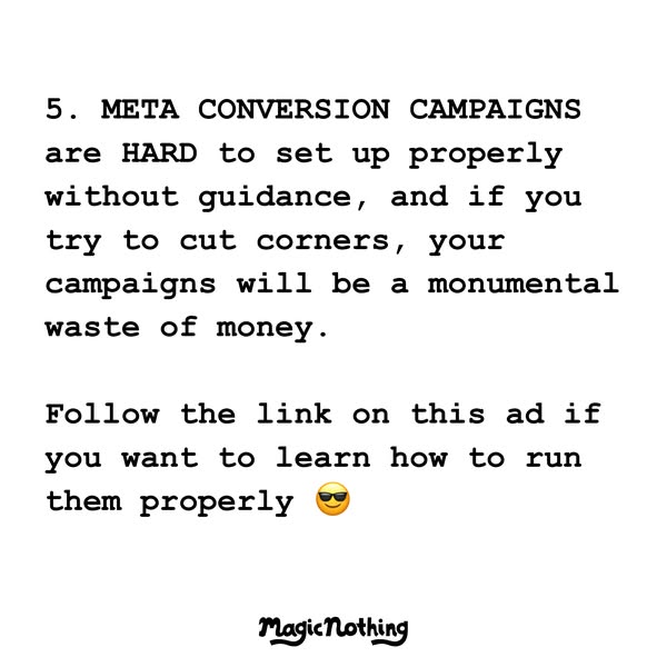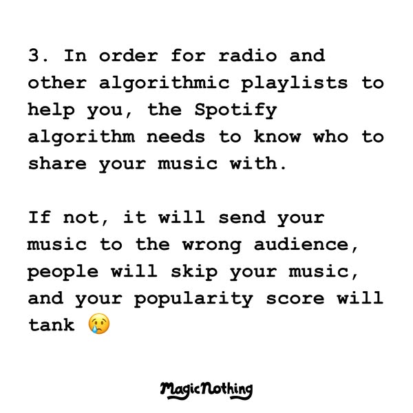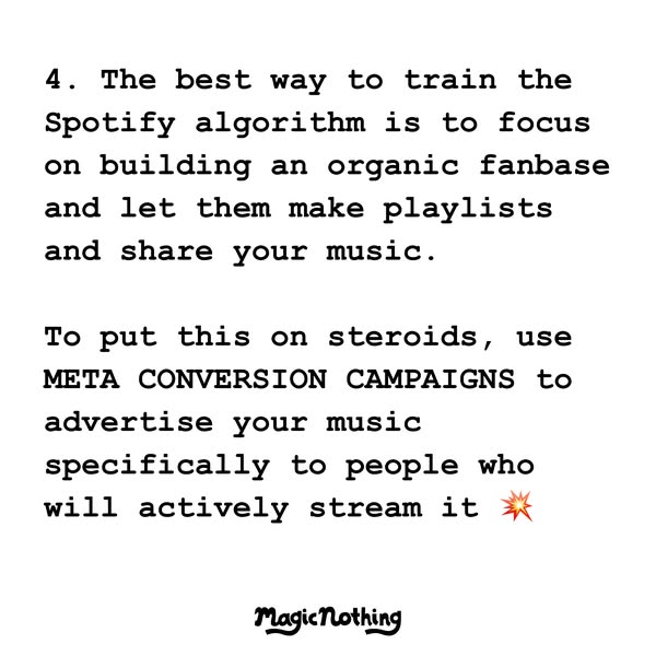 Notes: 1. Meta ads are DIFFICULT to set up correctly. Take our course or learn from a friend who knows wtf they’re doing so you don’t waste a ton of time and money! 2. Cost per campaign varies depending on a million factors including your goals, quality of music, quality of ad creative, competition, zeitgeist, set up, location, etc. 3. It’s HARD TO MAKE A RETURN from streaming on your ad spend, but this is a great way to get your music out there or build credibility around your work! 4. SPOTIFY IS A MARKETING TOOL. If you want to use it to build your audience, this is the way. DEFEAT IT OR DELETE IT 🚮 5. You NEED TO USE A LANDING PAGE AND PIXEL to set these up correctly. Traffic campaigns (direct links to spotify) are terrible in comparison because they don't filter for INTENT. ty4bh ✌️
