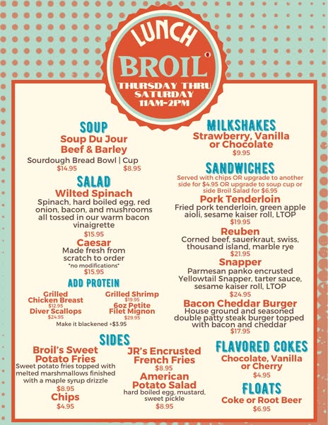 搜索关键词 steakhouse lunch, cudjoe key dinner, florida steak, island dining, broil restaurant, old state road, mm 21.5, gulf side, weekend lunch, key west food优势 Lunch service available,Dinner service available,Specific operating hours provided,Location details provided